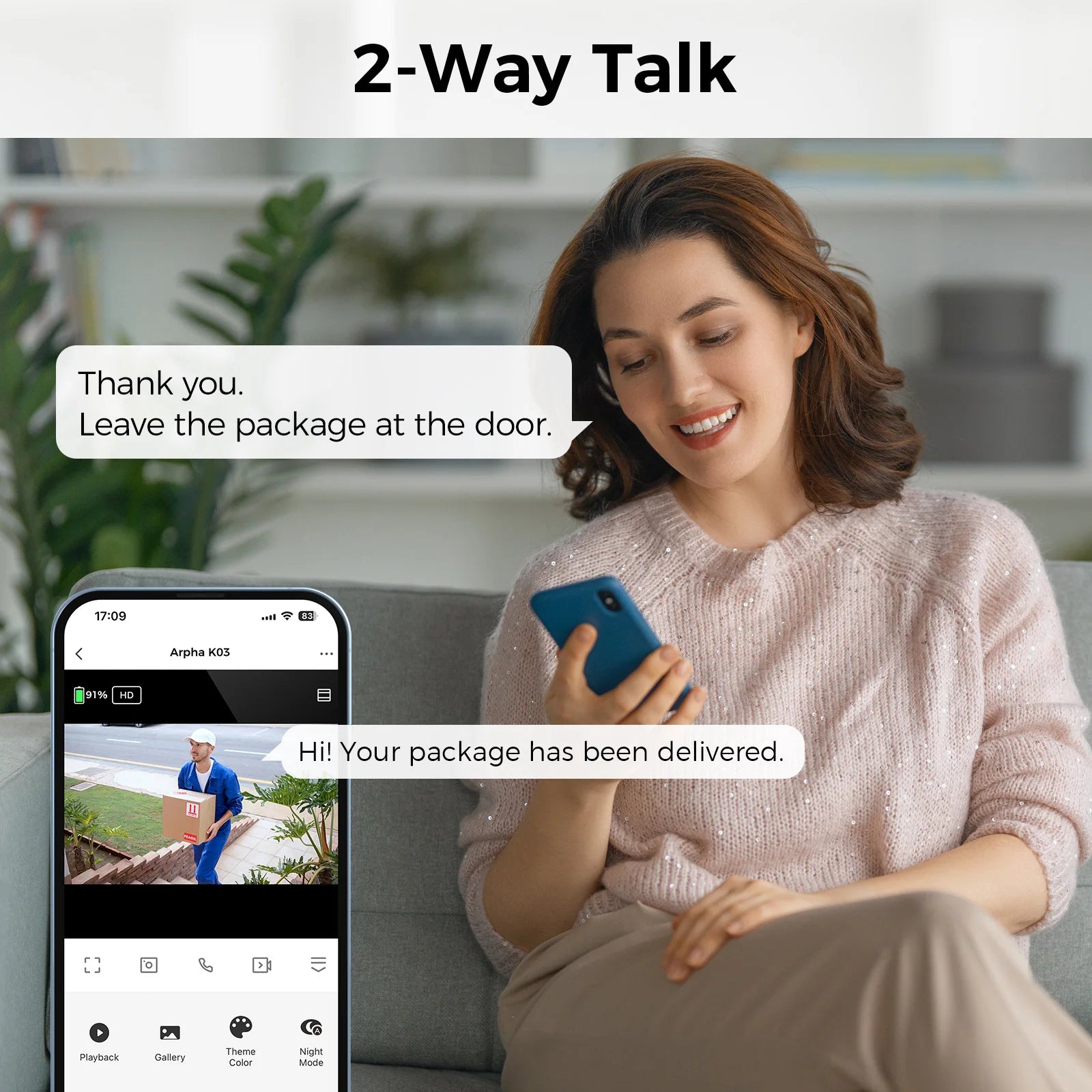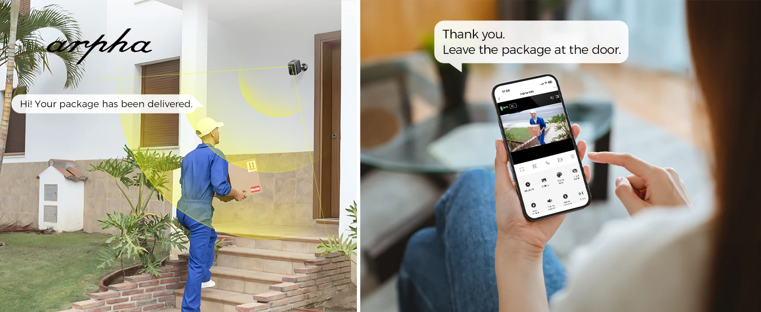 Two-way call, real-time communication:Built-in two-way audio function, you can easily talk with your family and visitors through the mobile app. When encountering suspicious people, it can also be a remote deterrent to stop unlawful behavior in time, making communication and guarding more timely and effective.