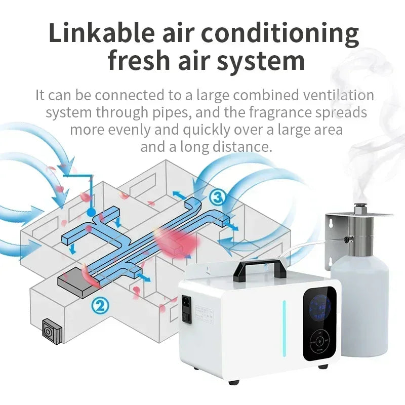Product Description: This product is a large essential oil aromatherapy machine, using two fluid technology to atomize the essential oil. Can be atomized separately, can also be linked to HVAC or central air conditioning, so that the aroma of essential oil molecules more powerful diffusion.
