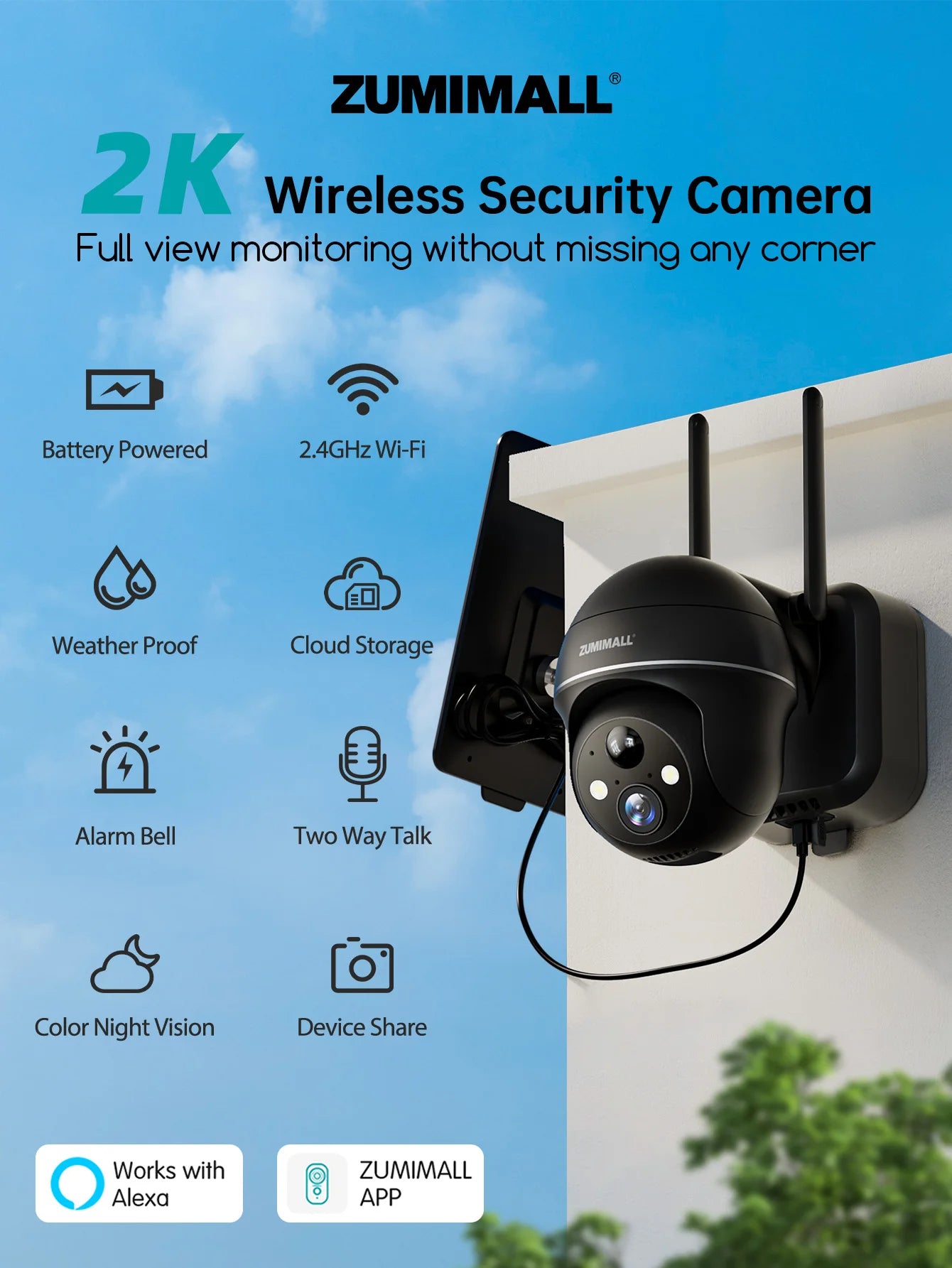ZUMIMALL Wireless Battery for Home security with 360° PTZ, 3MP Color Night Vision,2.4G WiFi, Spotlight & Siren,PIR/AI/2-Way Ta